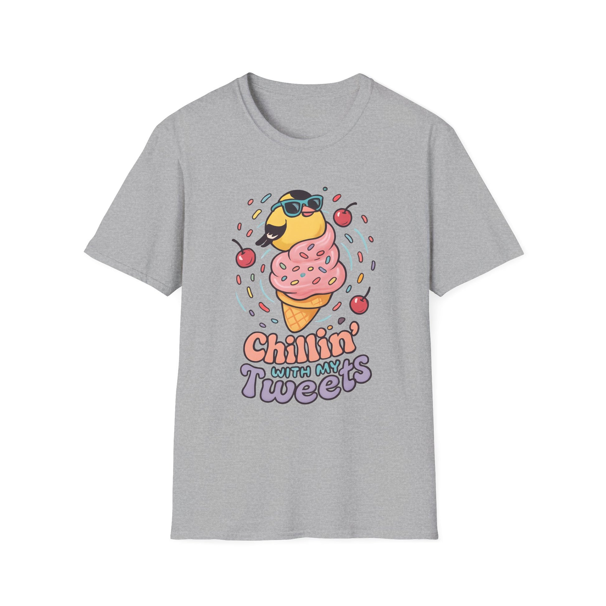 This playful kawaii t-shirt features the American Goldfinch (Spinus tristis) chilling on a giant ice cream cone with the fun phrase "Chillin’ with My Tweets." A perfect gift for bird lovers who enjoy lighthearted humor, summer vibes, and adorable cartoon-style designs.