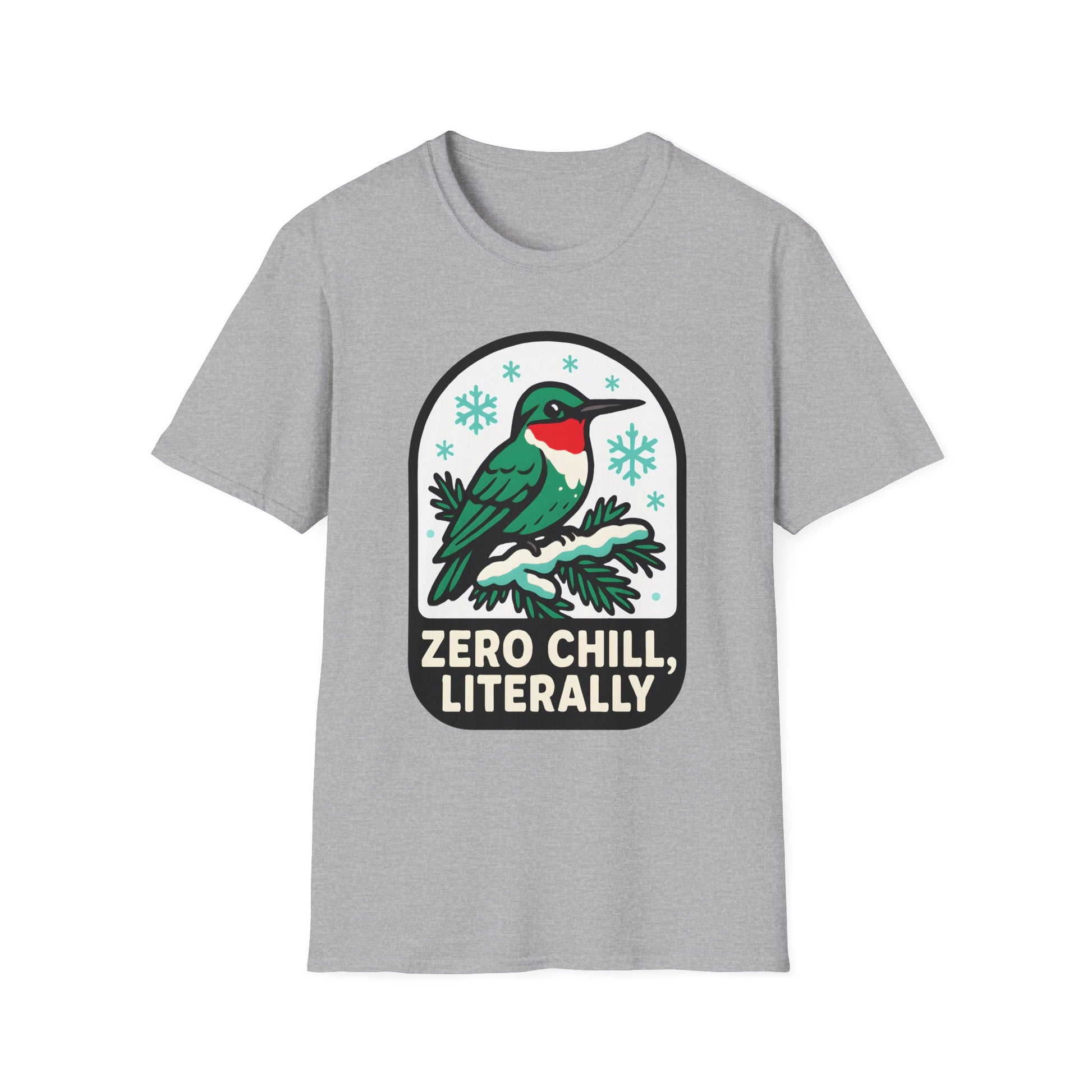 This sarcastic winter-themed t-shirt features the Ruby-throated Hummingbird (Archilochus colubris) in bold cartoon lines, paired with the witty phrase "Zero Chill, Literally." A playful gift for bird lovers and those who enjoy a touch of humor in nature-inspired apparel. Perfect for adding color and sarcasm to your wardrobe.