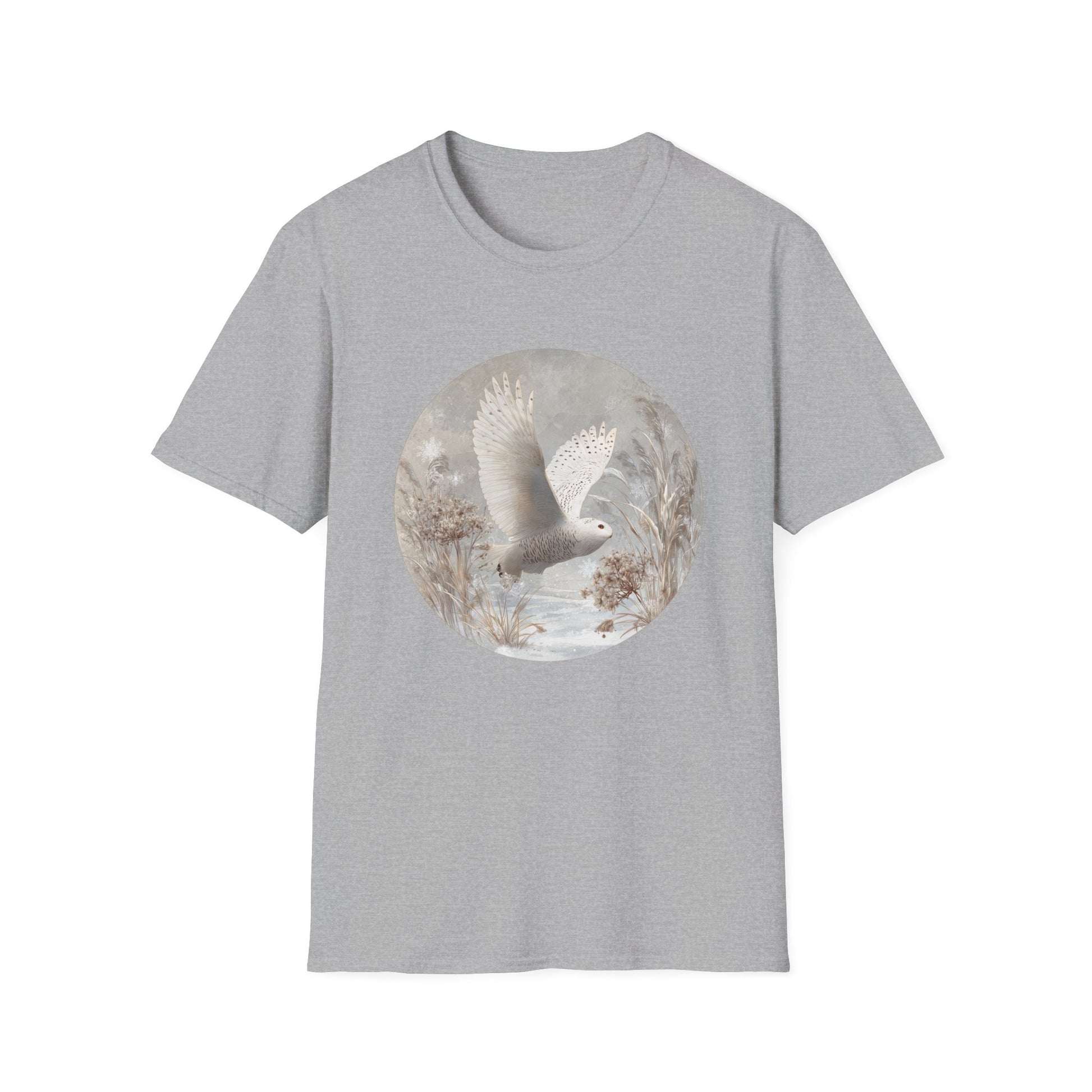 Celebrate the beauty of winter wildlife with our Snowy Owl T-Shirt. Featuring a graceful Snowy Owl (Bubo scandiacus) in flight among frosted grasses and delicate branches, this design is inspired by classic natural history illustrations.